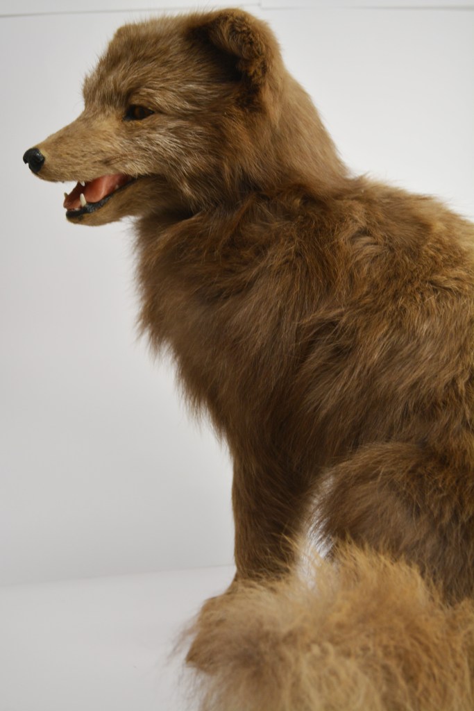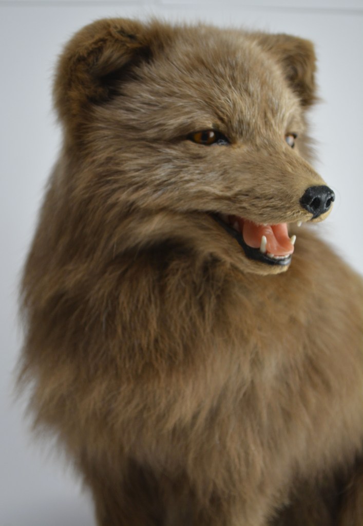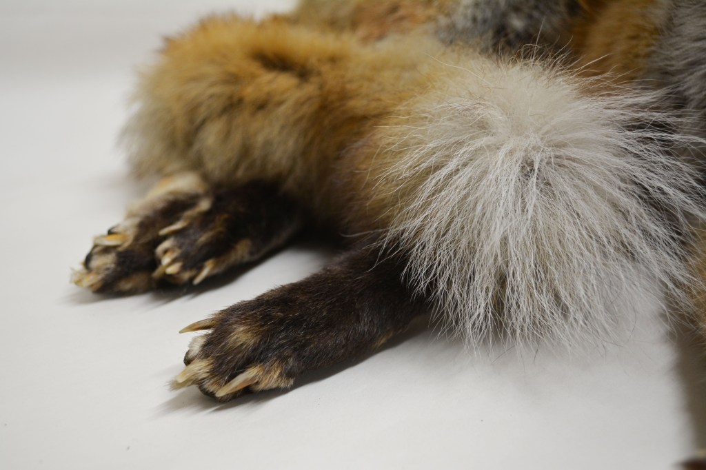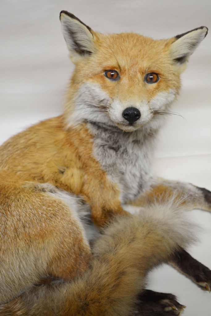 In comparison to the Red Fox, a different type of fox in a different environment will have different needs and characteristics. The Arctic Fox (Vulpes lagopus), NHM.60-2016, below, is well adapted to living in cold habitats. Its thick fur and its compact body shape, short muzzle and legs, small ears and furry foot pads help minimise heat loss.  It lives in extreme cold and does not start to shiver until the temperature drops to −70 °C!