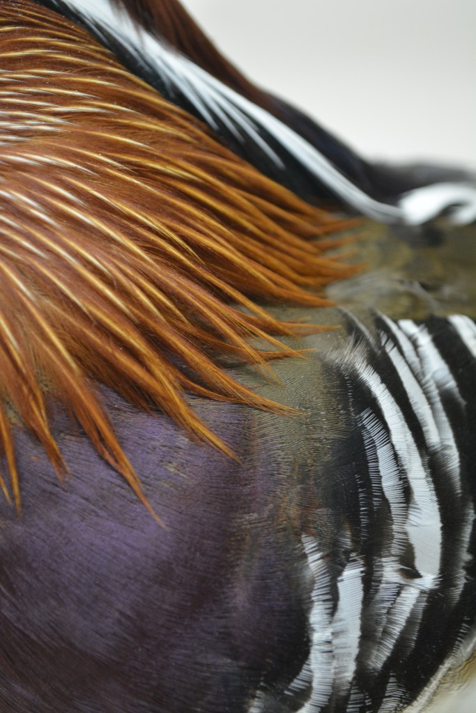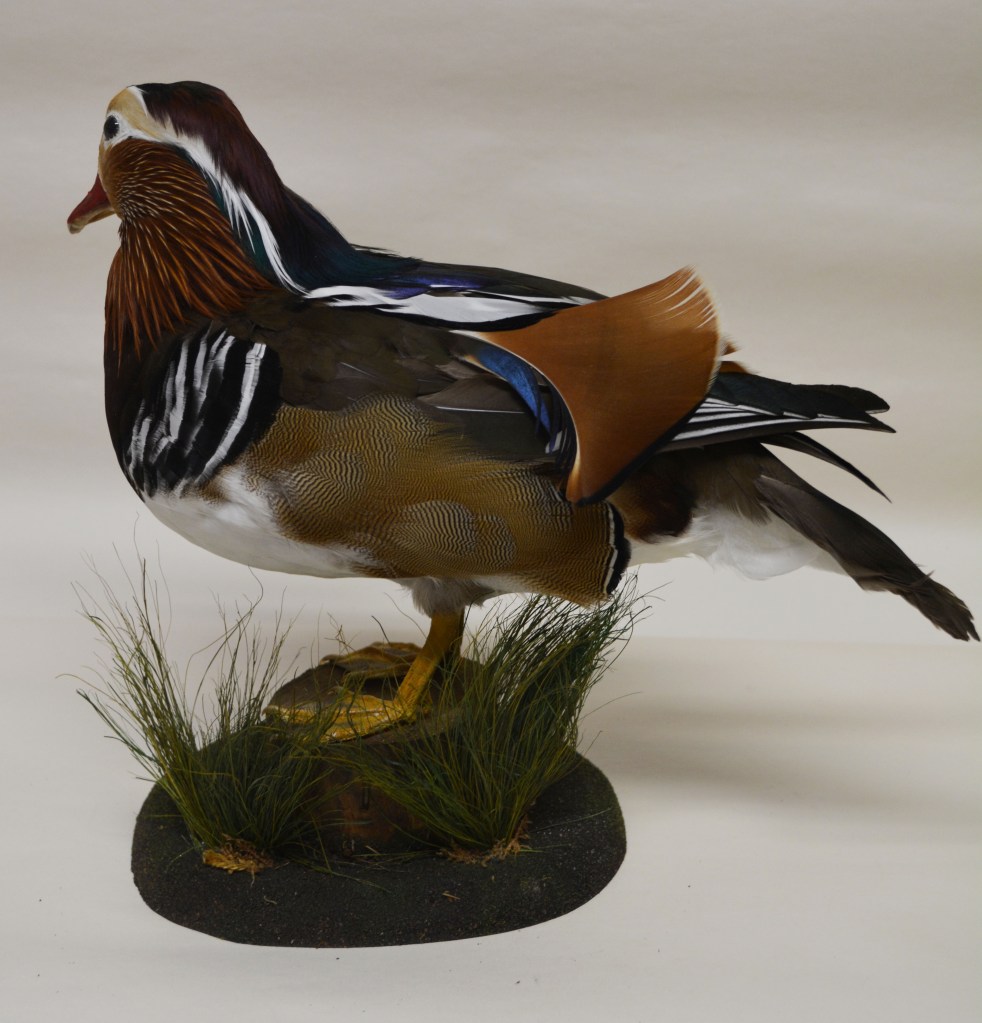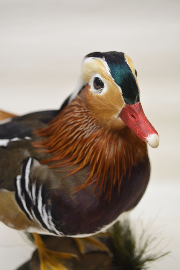 The Mandarin Duck is strikingly colourful; like many species of bird the male is more vibrant and decorative than the female. The colours would have connected to colours in the environment where they originated, as camouflage offers protection. The males’ more striking feathers would help get the attention of females during breeding season; they have brightly coloured wing ‘sails’ that make them stand out.