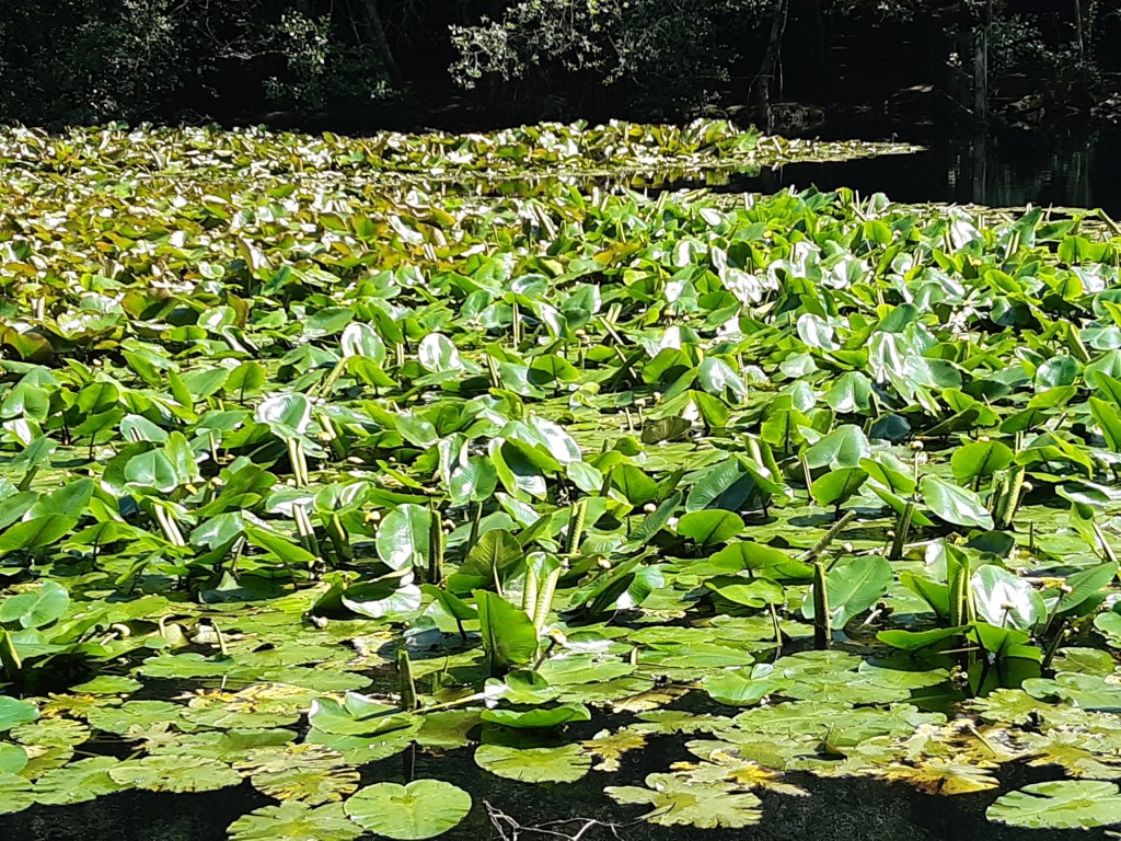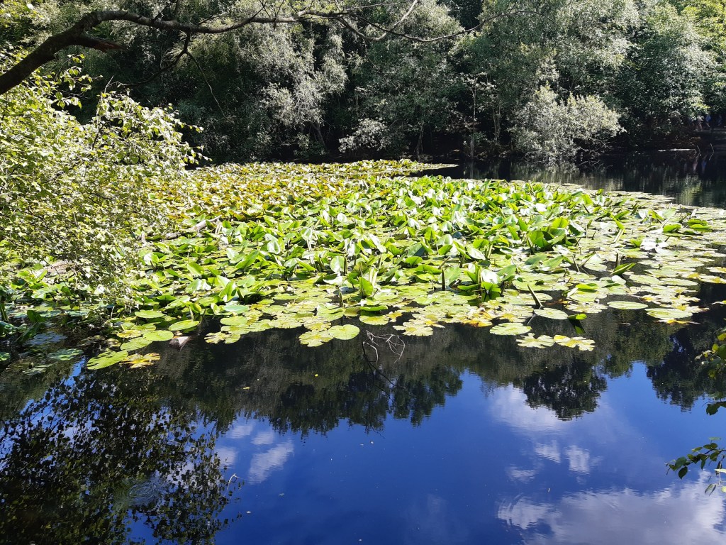 The area down the middle has fresh running water into two ponds. They alone support the water/ wetland birds such as Coots and Moorhens that pick their way through and along the lily pads.